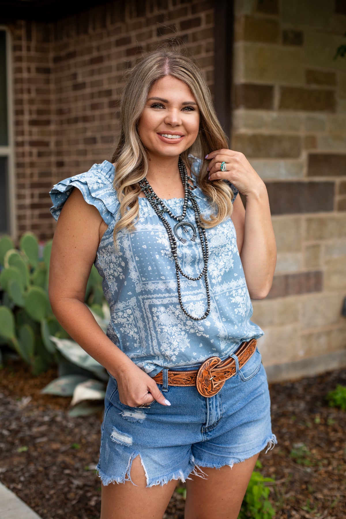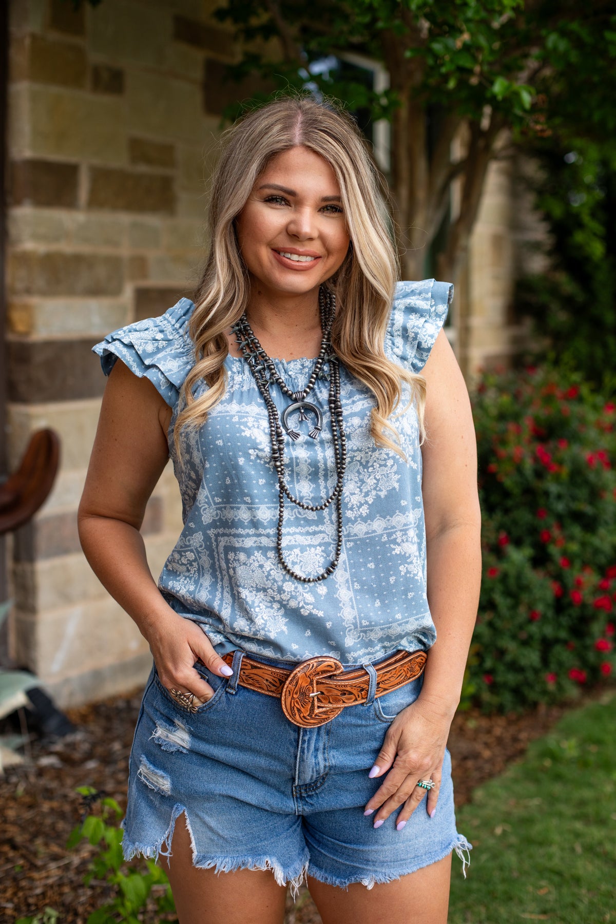 Dusty Blue Paisley Ruffle Top