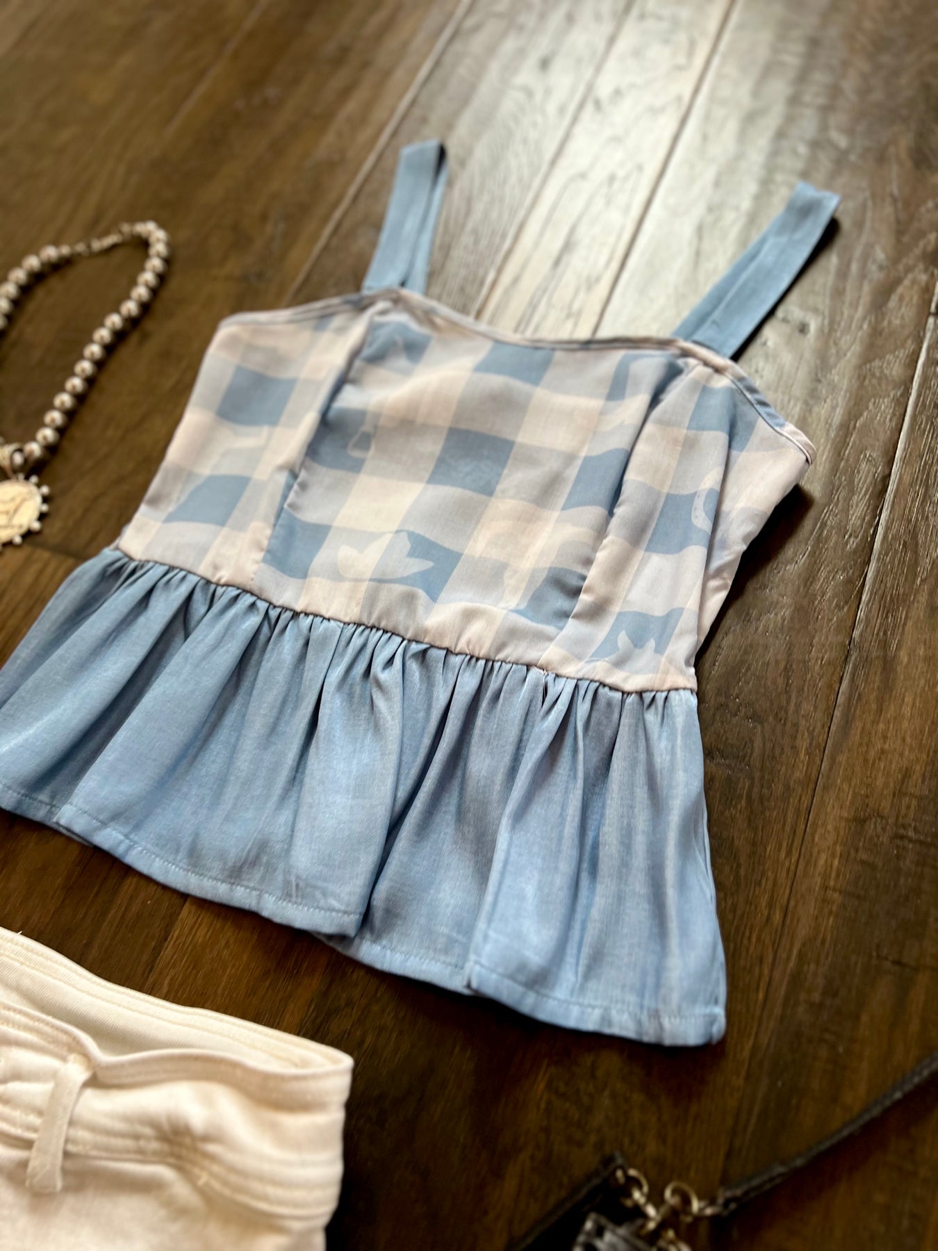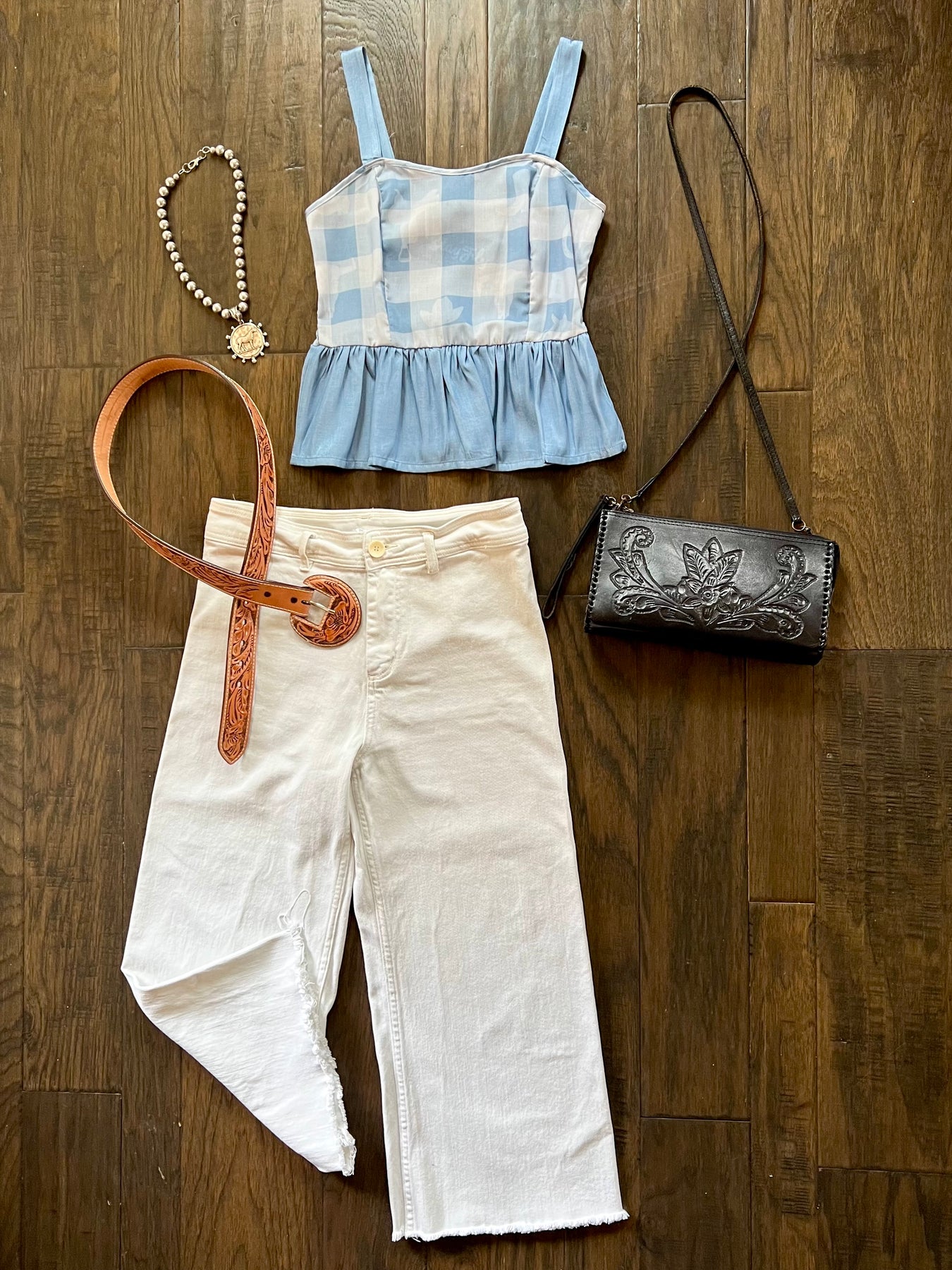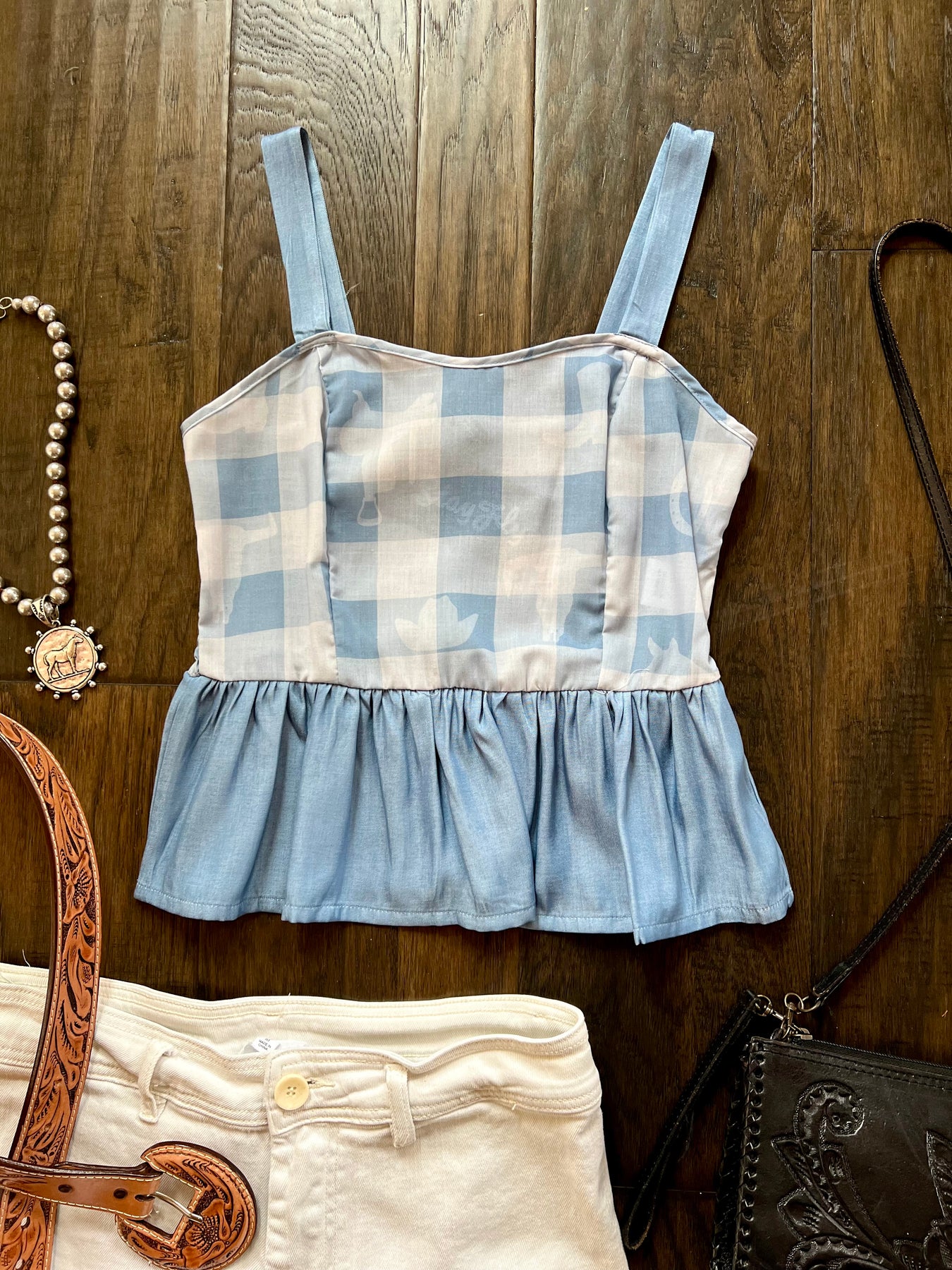 Checkered top with light western graphic details throughout